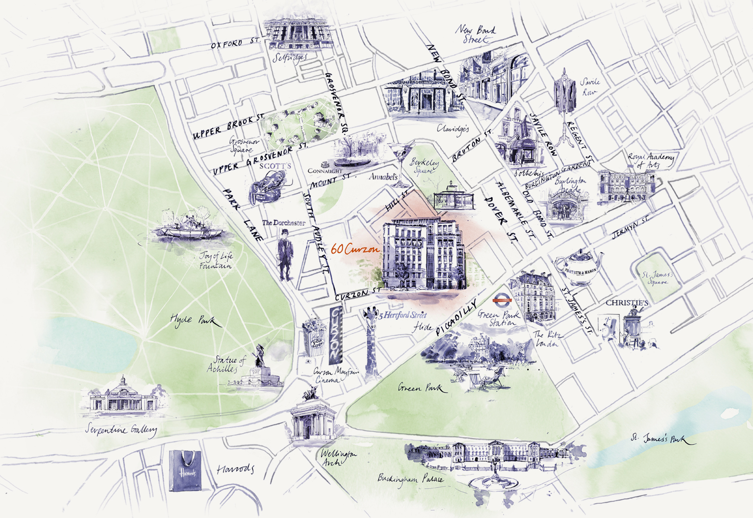 Situated in the heart of London’s most sought-after neighbourhood, 60 Curzon is surrounded by clubs, classic and cutting-edge art galleries, white-table-clothed restaurants and fashionable boutiques.
